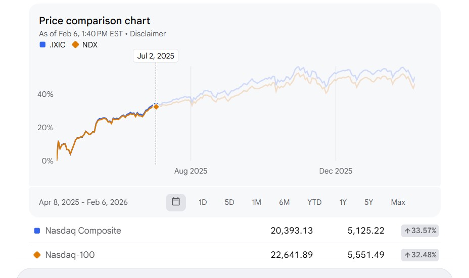 Could Conduent’s stock price drop be due to general economic downturns in the U.S. that we saw in wild swings as the president announced tariffs, rescinded tariffs, and made other announcements? For the same time period as in the previous figure, the Nasdaq index was going up throughout the summer and not dropping like Conduent’s price did towards the end of the year. From February 19, 2025 to February 5, 2026, Between February 19, 2025, and February 5, 2026, the NASDAQ Composite index increased by approximately 12.39%.